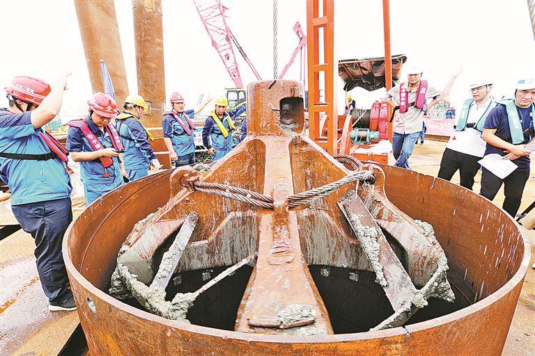 从施工流程上看,复合型桩基结合了钢筒复合桩和冲孔灌注桩两种施工工艺,作业流程较为复杂。它是项目打造“精品工程”的重要抓手:刘五店悬索桥西主塔区域花岗岩分化不均,球形孤石随机分布,在复杂的海底地质环境中先打入预制钢护筒,如同为桩基工程提前精确了“施工坐标”。瞄定筒芯、靶向作业,眭文飞告诉记者,这类复合钢管桩不仅可以有效参与桥梁结构受力,还能有效抵抗海水对混凝土的腐蚀,提高了桥梁耐久性,确保了海中桥梁使用寿命。