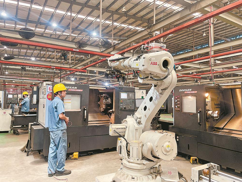 近日,在银华机械“5G智慧工厂”,工人正操作机械臂开展相关作业。