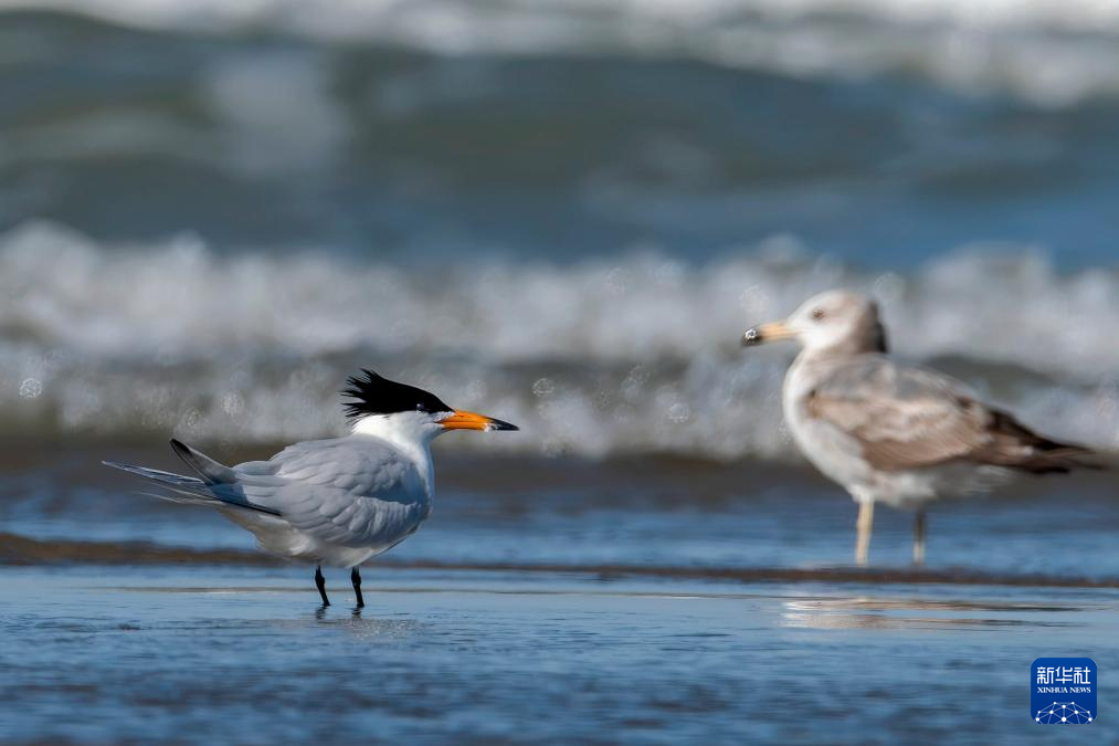 一只中华凤头燕鸥(左)和黑尾鸥在闽江河口湿地海滩觅食(5月14日摄)。新华社记者 魏培全 摄