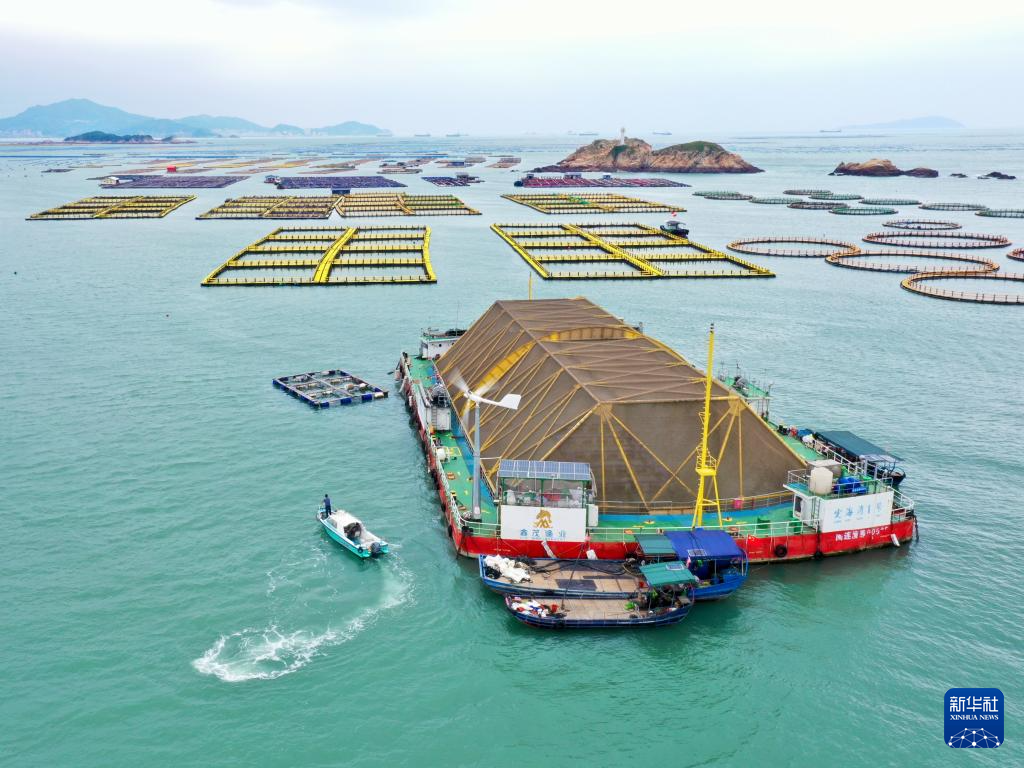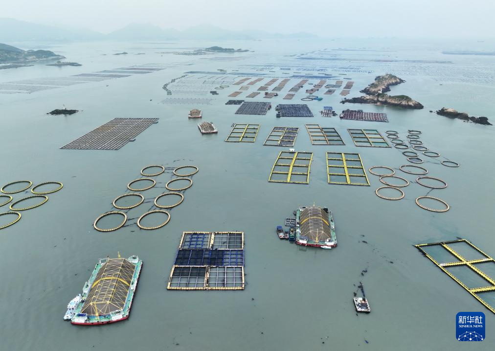 在福建连江定海湾海域,坐落着“定海湾1号”“定海湾2号”等深远海养殖平台(2024年5月7日摄,无人机照片)。新华社记者 林善传 摄