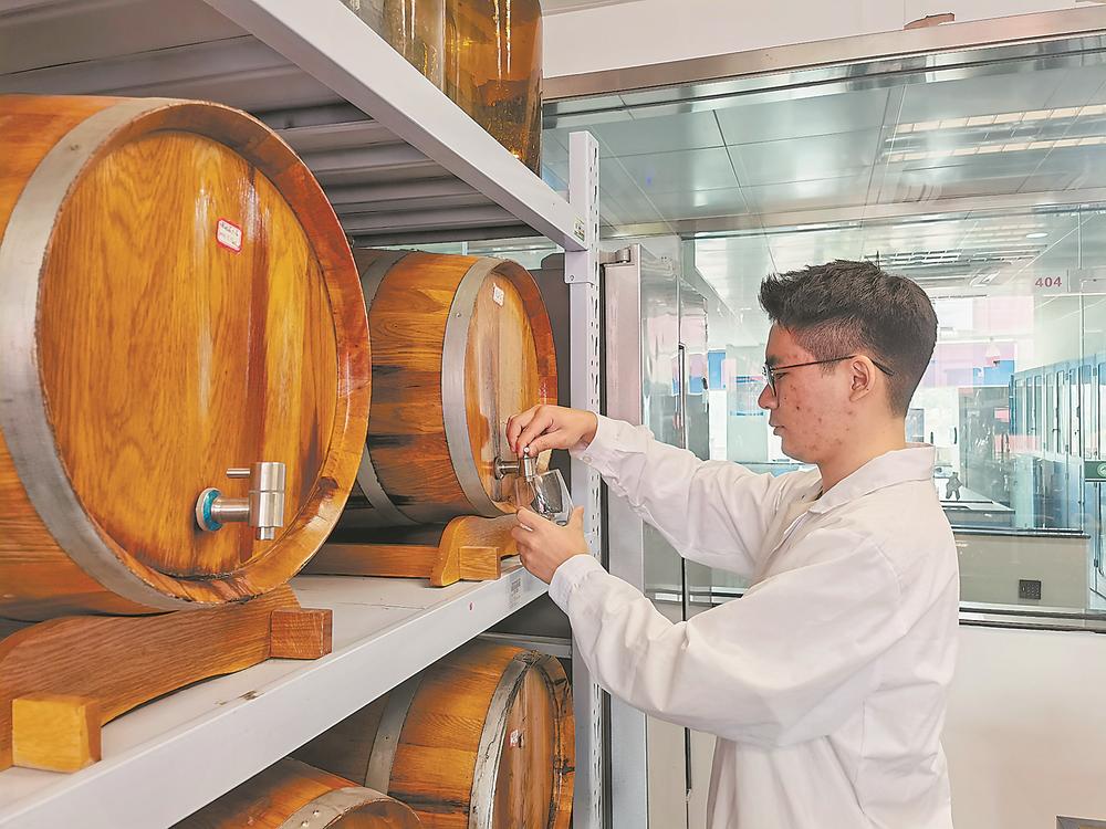 在农产品深加工创研实验室里,一罐2019年酿造的白肉蜜柚白兰地,要接受工作室团队的“味蕾检验”。