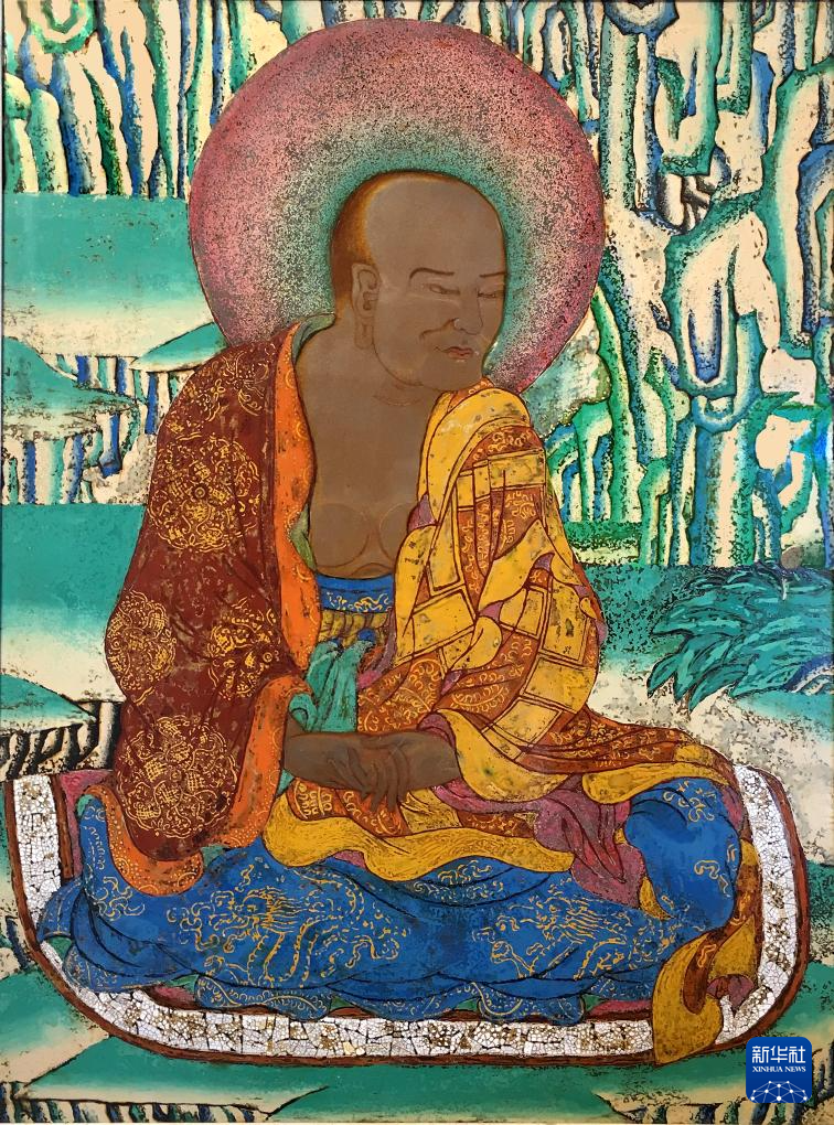仁青郎加的第一幅唐卡漆画作品——《指小路尊者》。新华社发