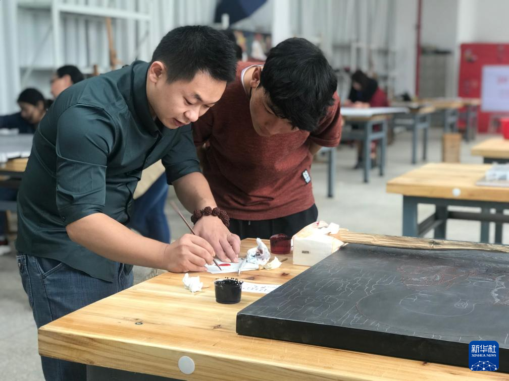 2018年,仁青郎加(右)正跟老师学习漆画技法。新华社发