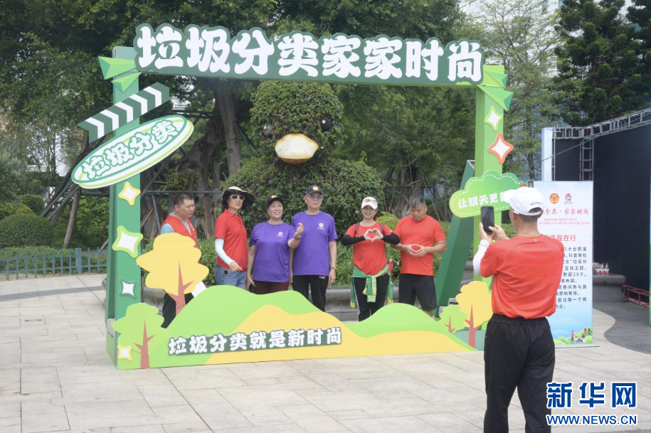 市民们在垃圾分类主题背景墙拍照打卡。新华社记者 李昊泽 摄