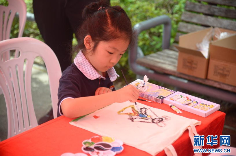 一位小朋友正用环保绘画颜料在帆布袋上作画。新华社记者 李昊泽 摄