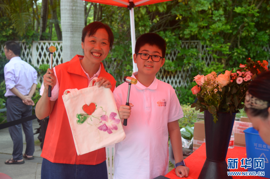 巾帼志愿者与小市民一同展示用废弃菜叶、果皮、花瓣拓印的帆布袋。新华社记者 李昊泽 摄