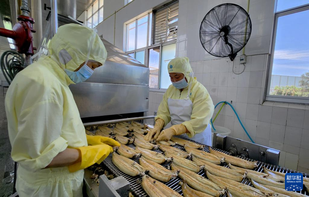 工作人员在福州长乐聚泉食品有限公司的蒲烧烤鳗加工生产线上加工烤鳗(5月15日摄)。