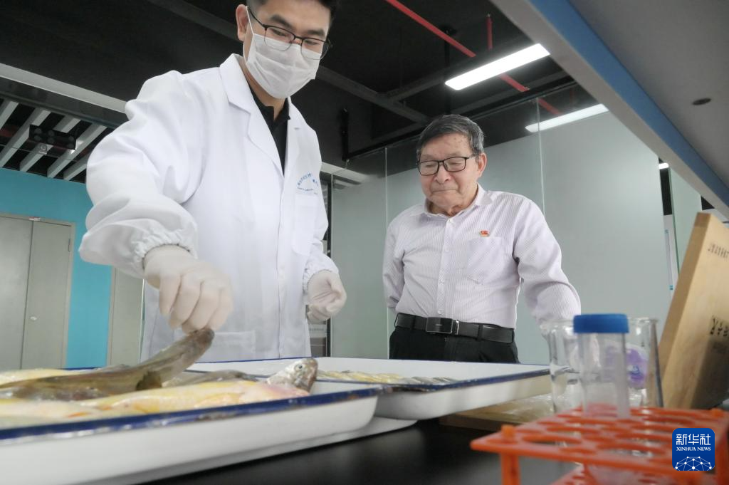 2024年5月8日,大黄鱼育苗技术专家刘家富(右)在位于福建宁德的海水养殖生物育种全国重点实验室了解大黄鱼的培育情况。新华社记者 林善传 摄
