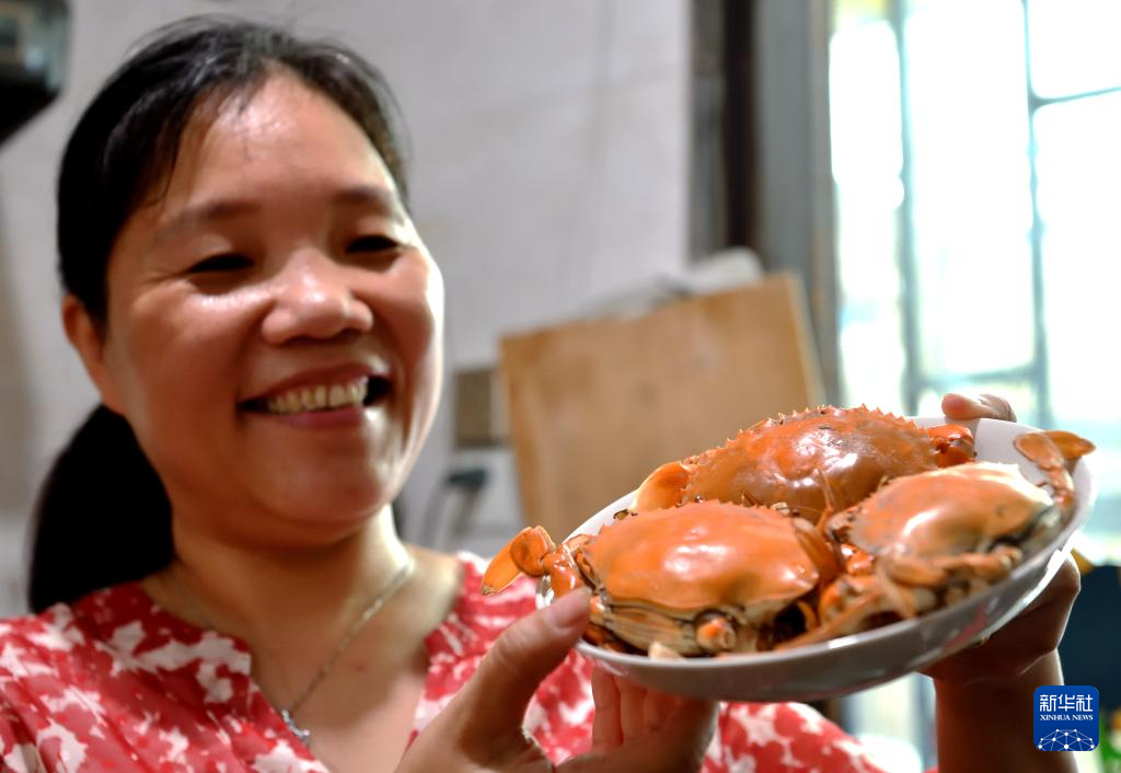 福州市连江县浮曦村村民甘淑芳向记者展示一盘自己蒸熟的红蟳(2023年9月14日摄)。新华社记者 魏培全 摄