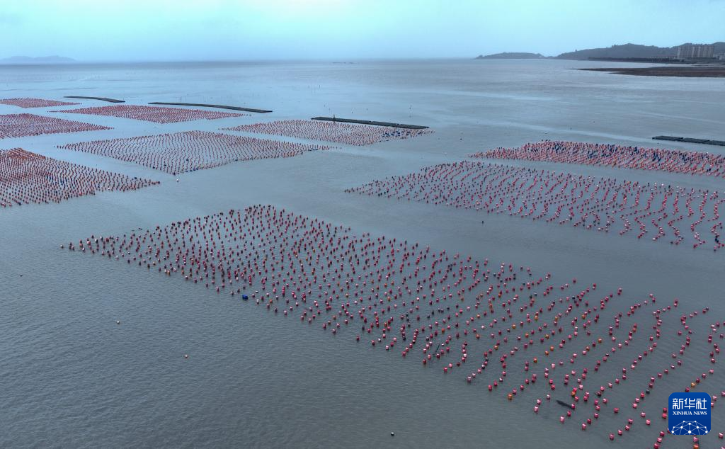 2024年5月9日拍摄的福建省霞浦县沙江镇沙江村附近海域竹竿晾晒海带场景(无人机照片)。新华社记者 林善传 摄