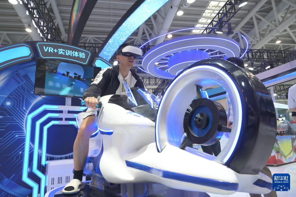 5月23日,观众在现场体验光速飞轮VR摩托竞速大型体感游戏机。新华社记者 林善传 摄
