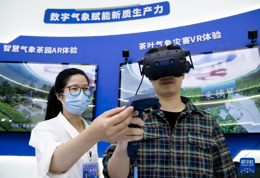 5月23日,一名观众(右)在数字气象赋能新质生产力展台上进行体验。