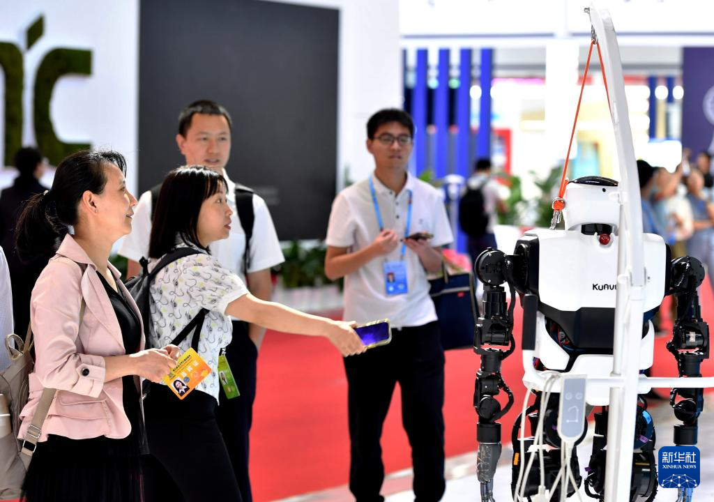 5月24日,在第七届数字中国建设峰会现场体验区,观众在观看“移动爱家机器人”。新华社记者 魏培全 摄