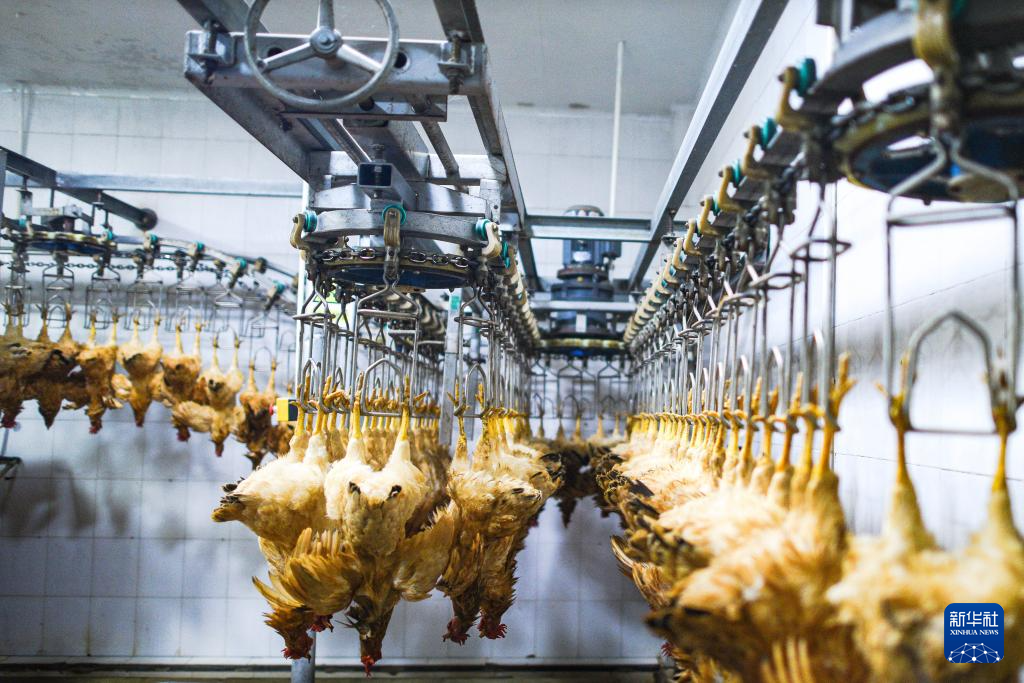 标准化屠宰车间里,河田鸡正在等待加工。新华社记者 李昊泽 摄