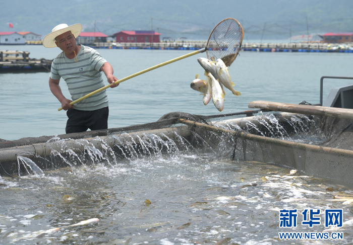 2024年5月8日,养殖户在福建宁德三都澳白基湾渔排挑选大黄鱼。新华社记者 林善传 摄