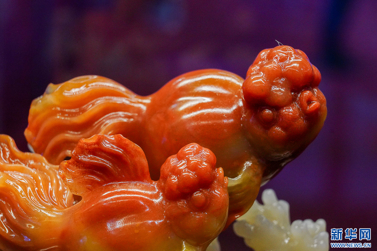 这是微距镜头拍摄到的寿山石雕,金鱼造型栩栩如生。新华网 肖和勇 摄