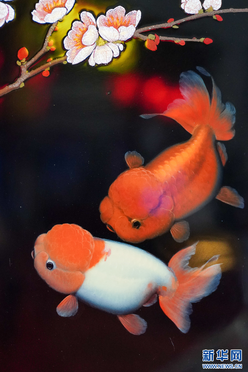 这是漆器作品,两条金鱼在花下游动。新华网 肖和勇 摄