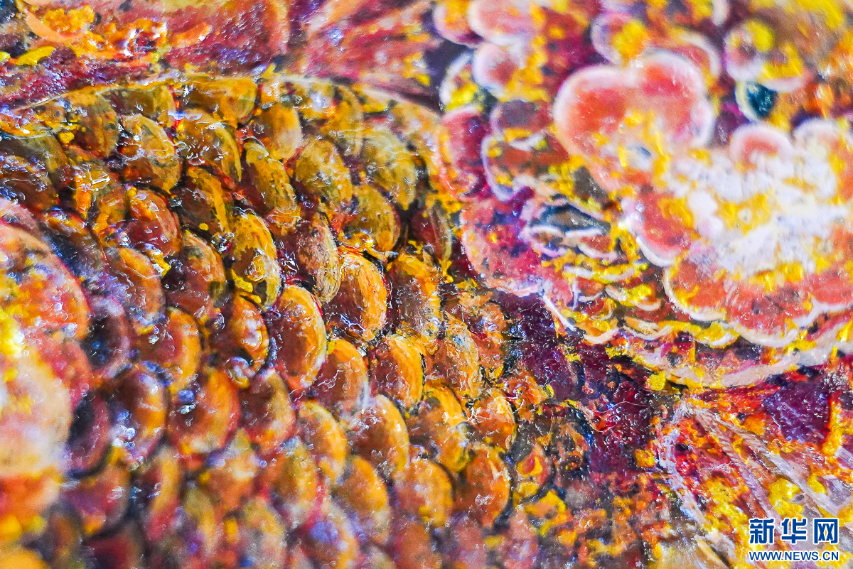 这是微距镜头拍摄到的金鱼漆器作品局部特写。新华网 肖和勇 摄