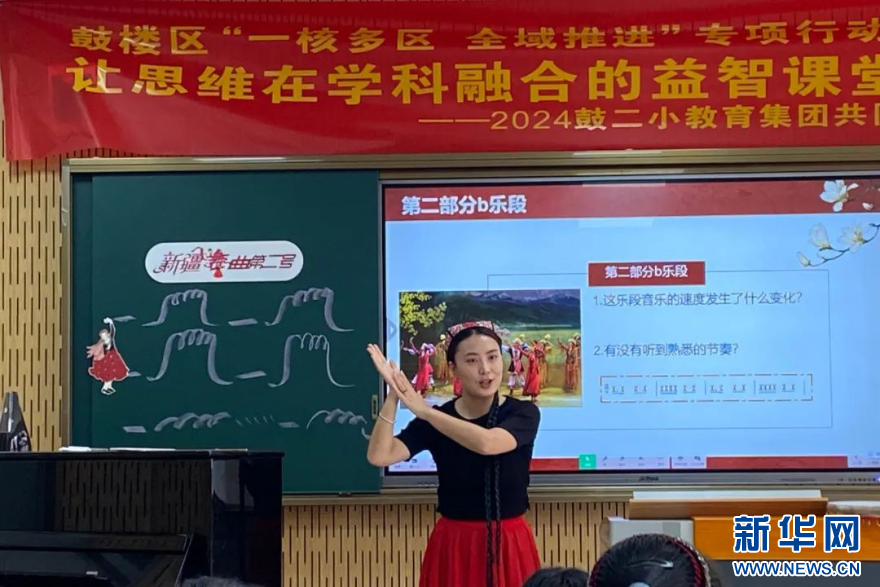 鼓二小军门校区音乐老师周颖采用情景法、律动法、图谱法、舞蹈创编等多种教学方法,让学生在妙趣横生的音乐课堂中学习民族知识、感受新疆音乐和新疆舞蹈的独特魅力。新华网发(福州市鼓楼第二中心小学教育集团供图)