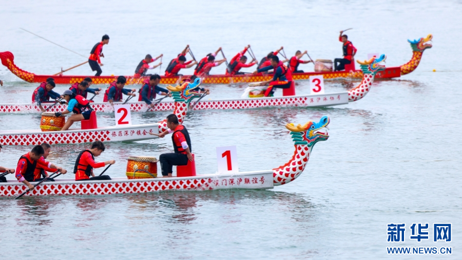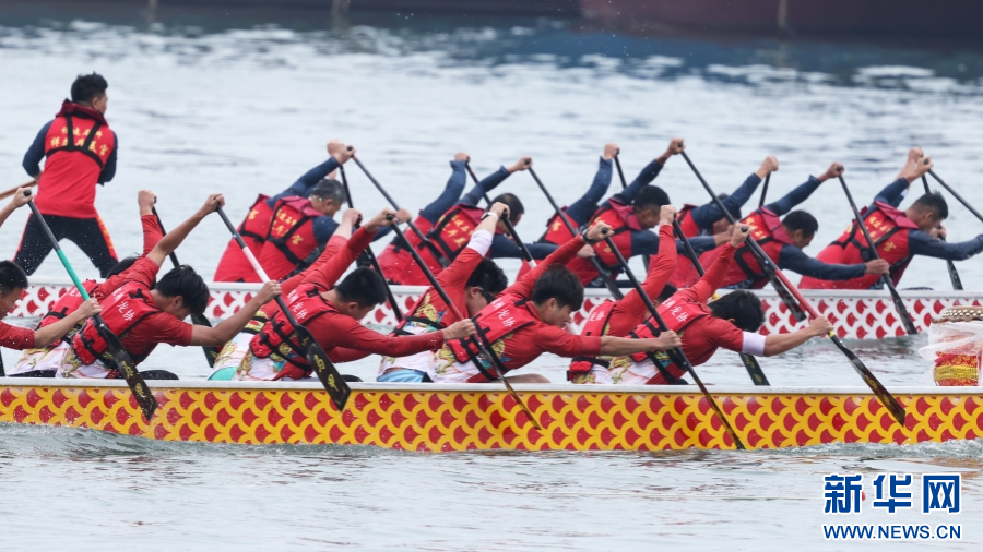 伴着阵阵擂鼓声,龙舟队员奋力挥桨,竞速角逐。新华网发(刘翼 摄)