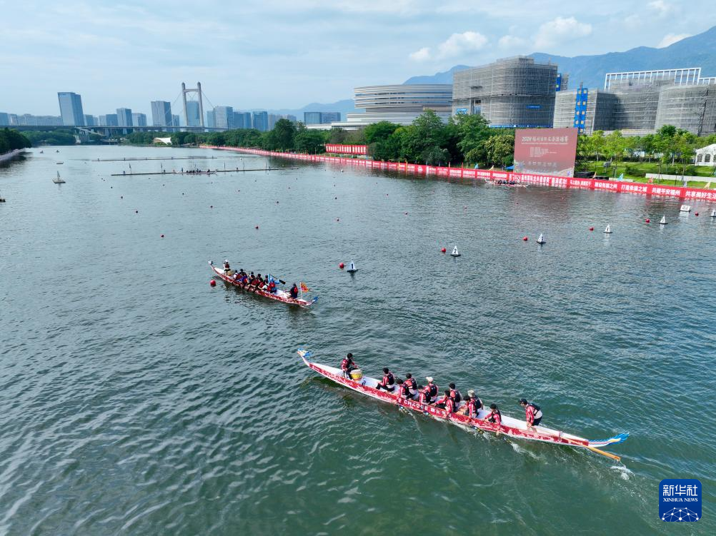 6月8日,参加2024福州国际龙舟邀请赛的选手在福州市浦下河进行适应性练习(无人机照片)。新华社记者 姜克红 摄