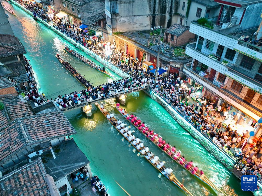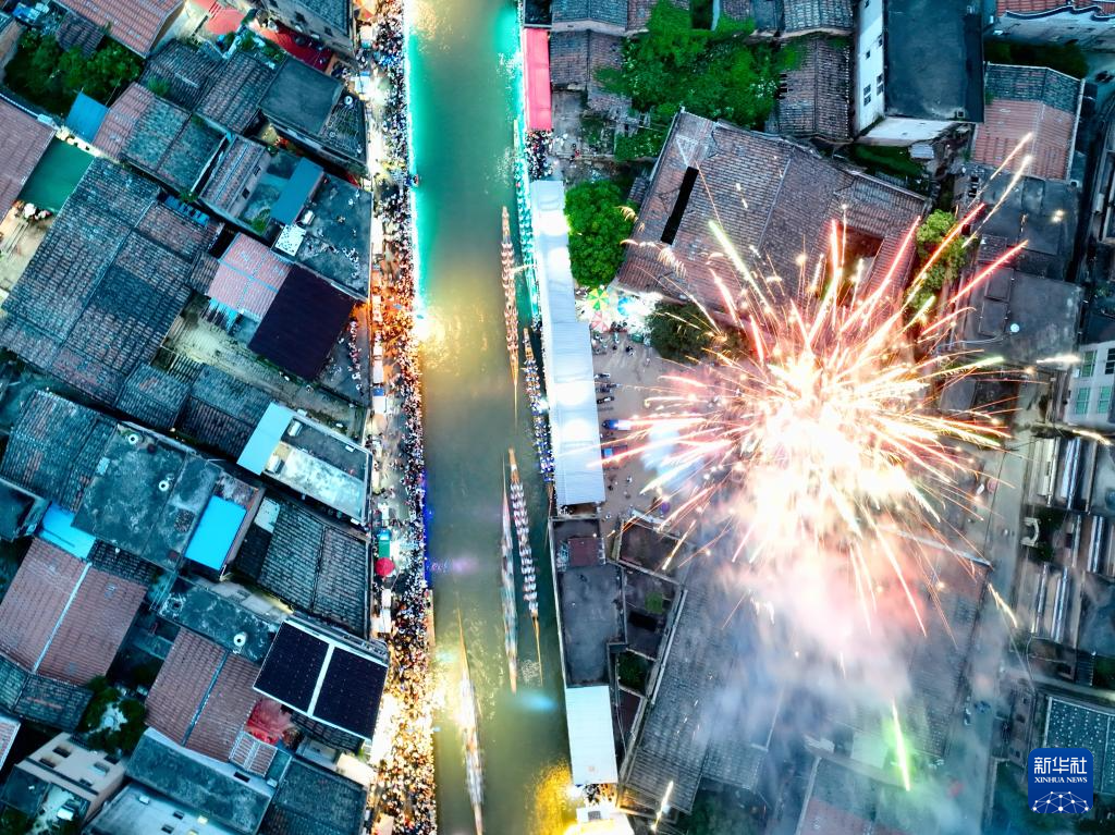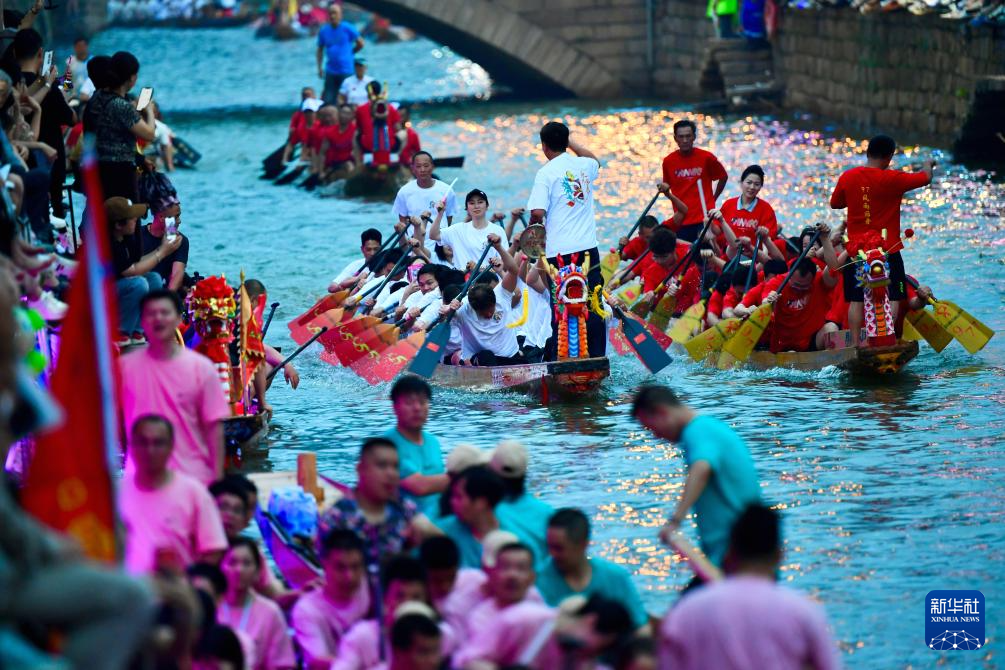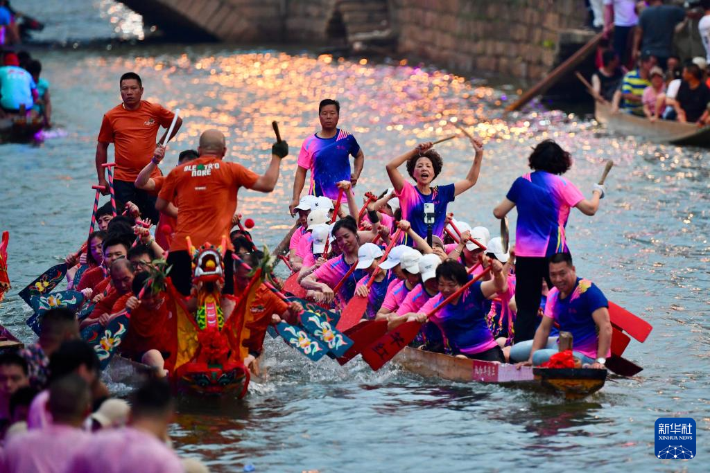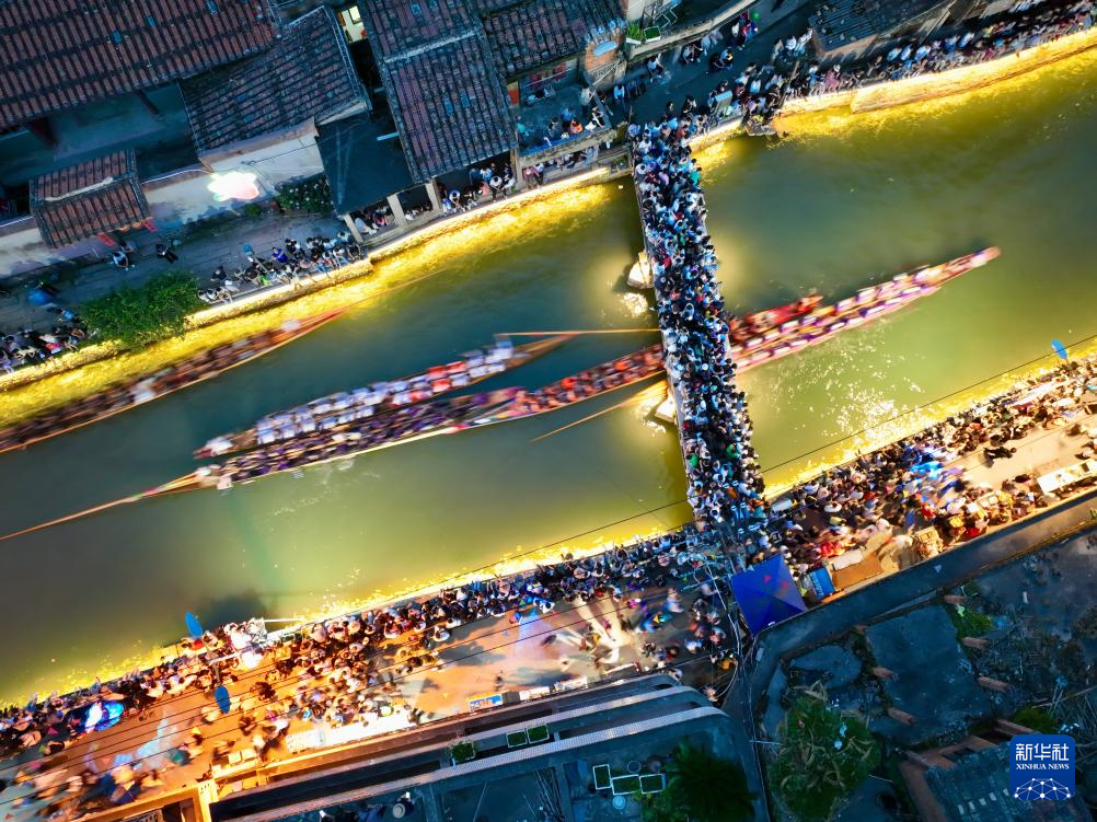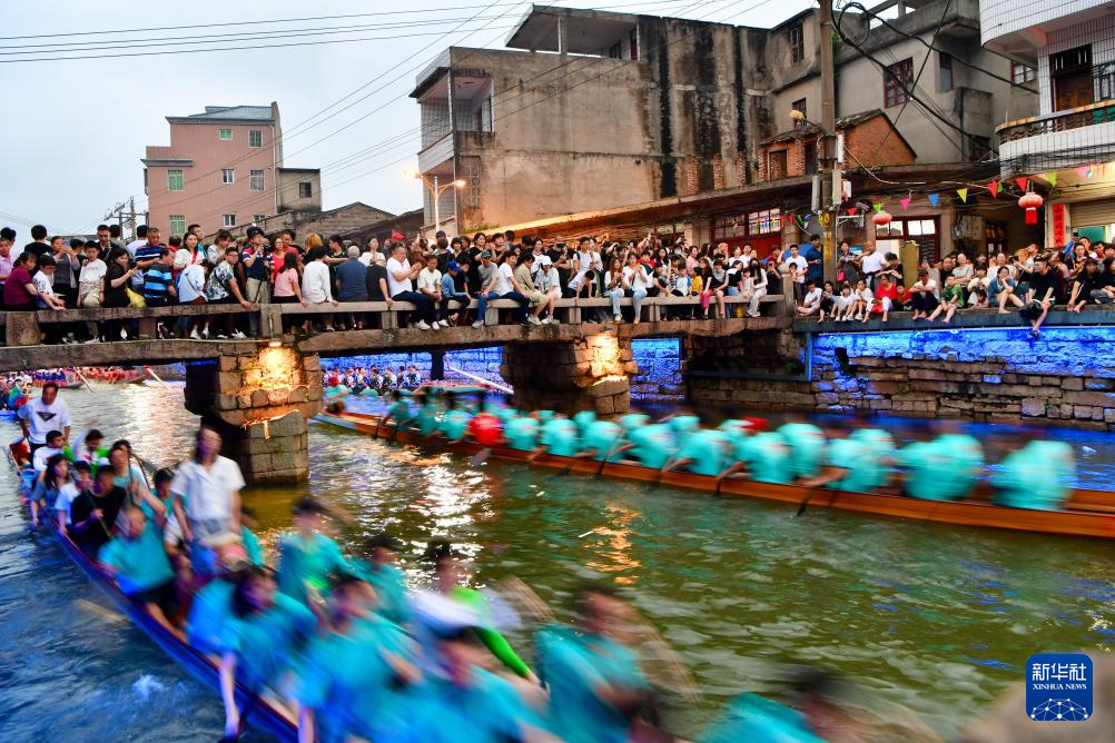 6月9日,福建省福州市长乐区三溪村夜赛龙舟民俗活动如约而至。随着夜幕降临,三溪村民及远道而来的龙舟爱好者们组成的龙舟队驭舟飞驰,挥桨竞渡,南溪两岸及石桥上人潮如涌,热闹非凡。