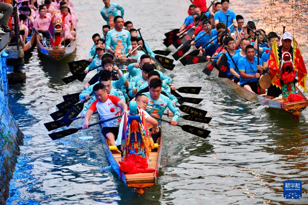 6月9日,福州市长乐区三溪村,龙舟在南溪上穿村而过(无人机照片)。新华社记者 姜克红 摄
