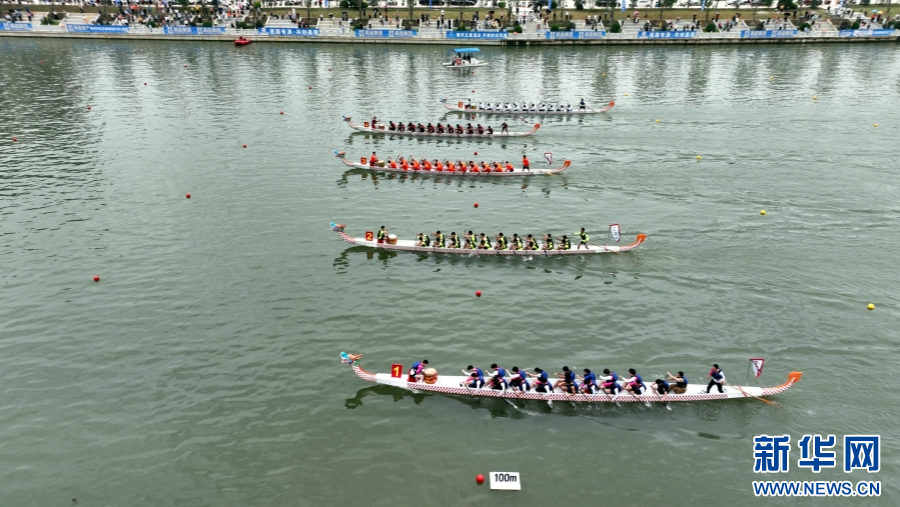 在2024年泉州海丝“源昌杯”世界龙舟大赛现场,俯瞰龙舟竞渡。新华网发(林楷煜 摄)