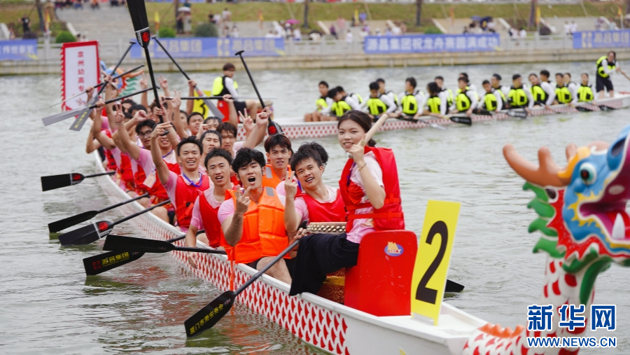 2024年泉州海丝“源昌杯”世界龙舟大赛现场,选手庆祝完赛。新华网发(林楷煜 摄)