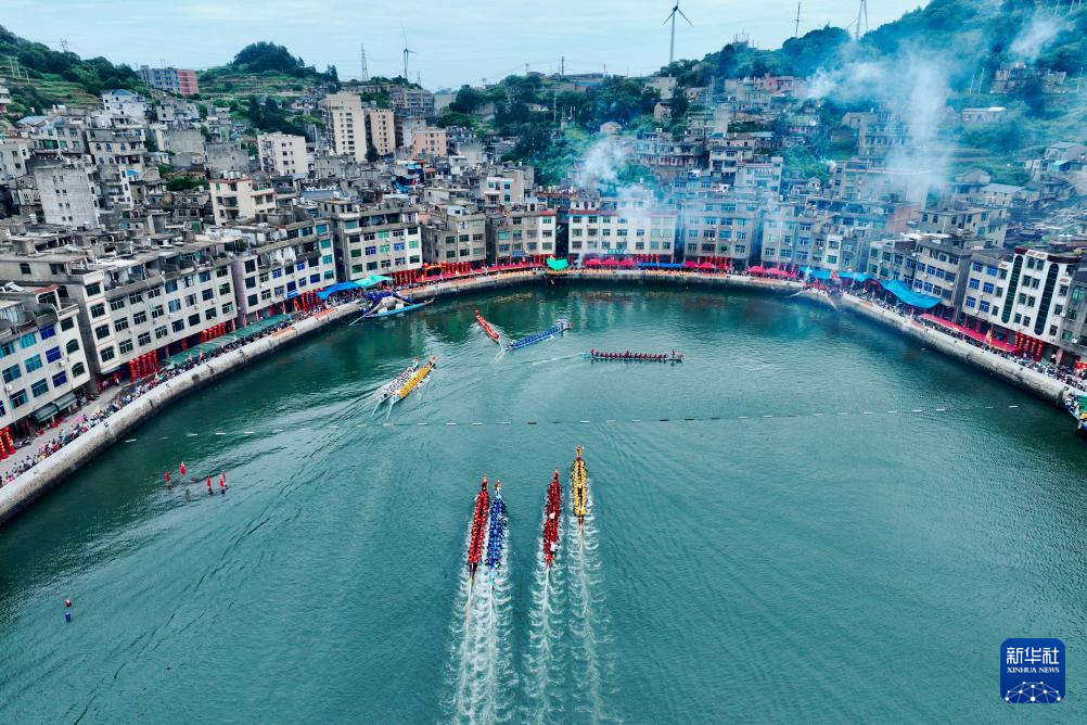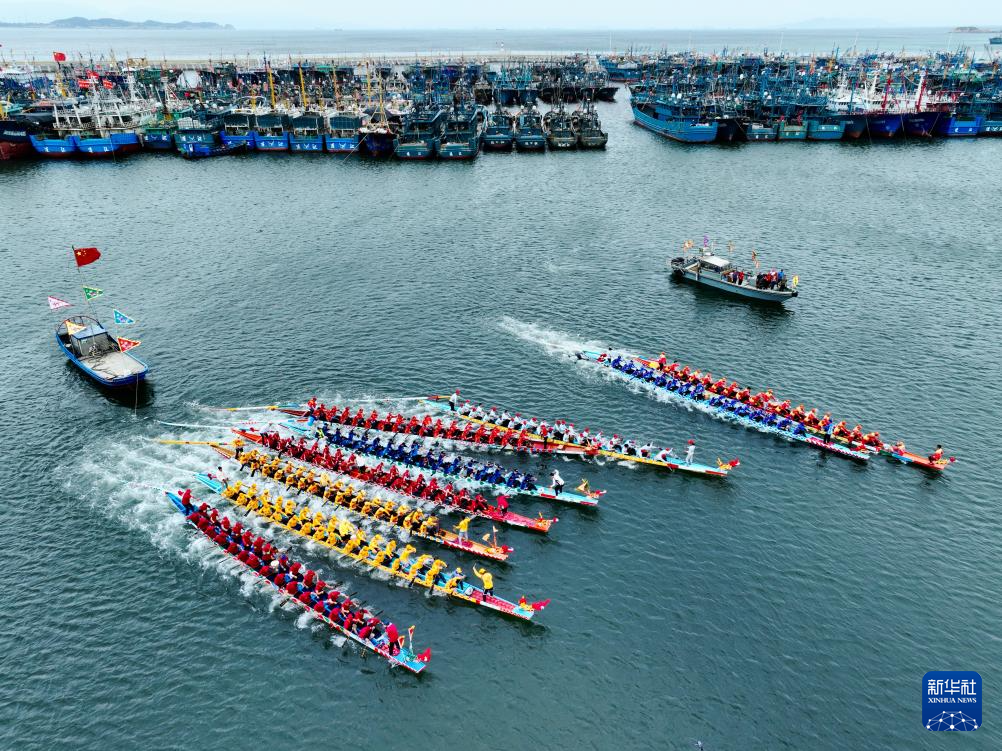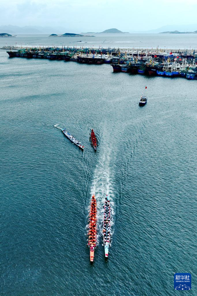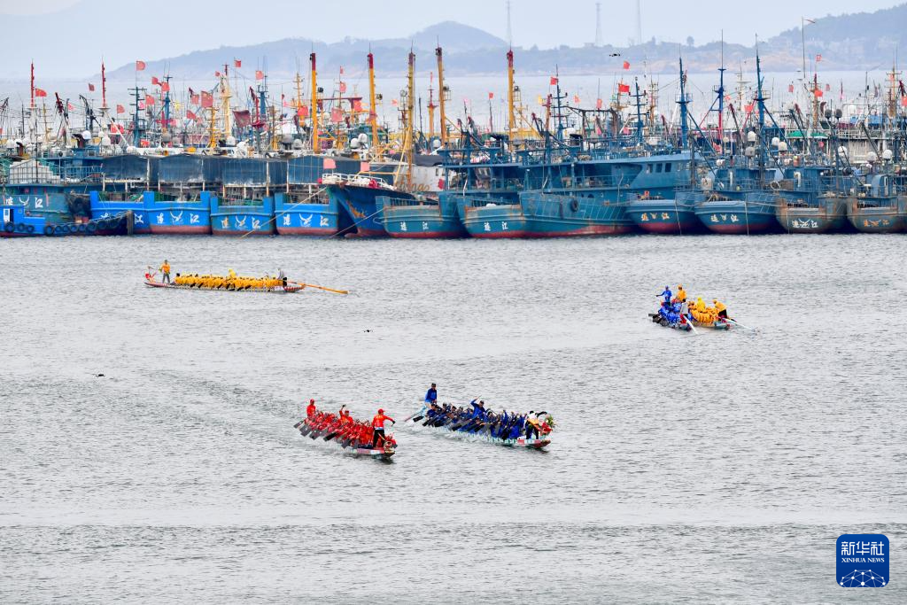 当日,福建省福州市连江县苔菉镇在苔菉中心渔港举行海上赛龙舟活动,来自各村的龙舟队开展海上竞渡、庆端午联谊活动,以祈求风调雨顺、五谷丰登。连江县海上赛龙舟民俗历史悠久,从农历五月初一至五月初八,渔民们长达8天的海上赛龙舟活动成为远近闻名的端午文化盛宴,吸引众多游客前来观赏。