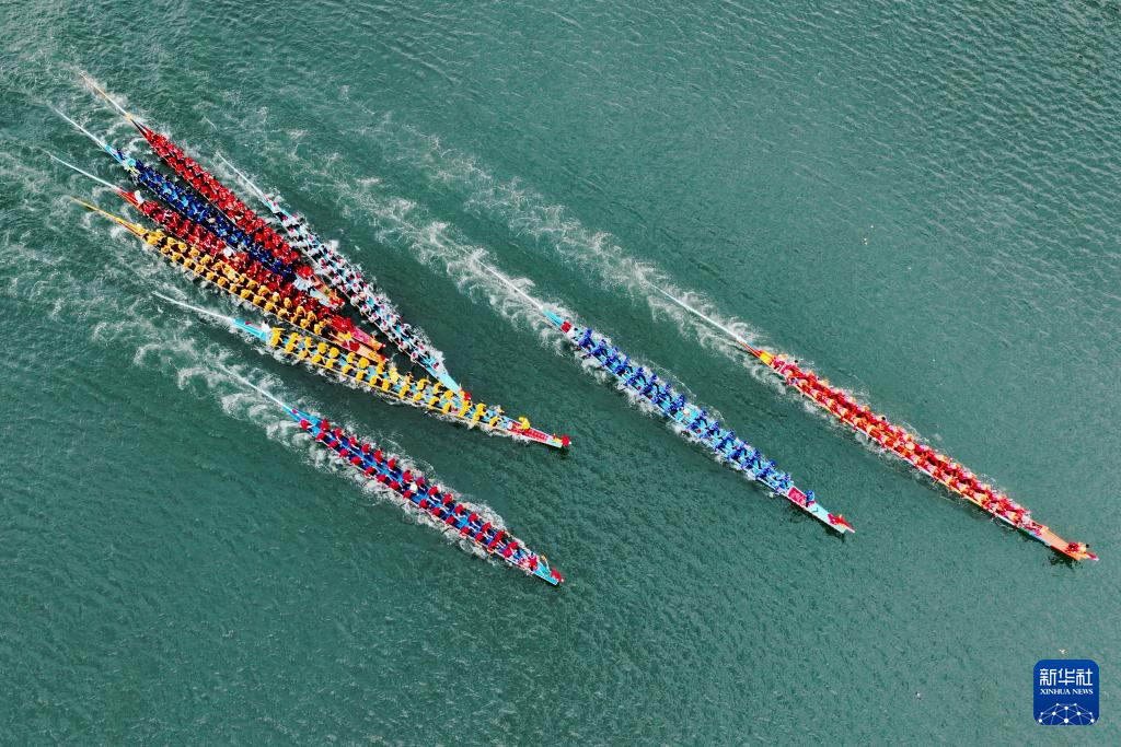6月11日,龙舟在连江县苔菉中心渔港海面上竞渡(无人机照片)。新华社记者 姜克红 摄