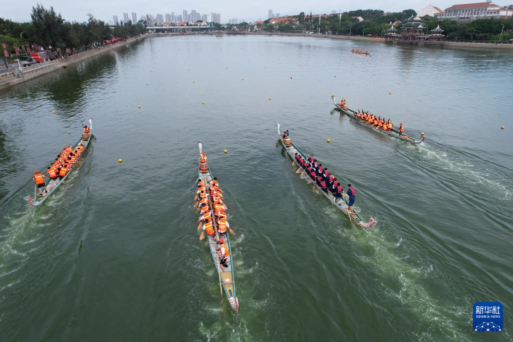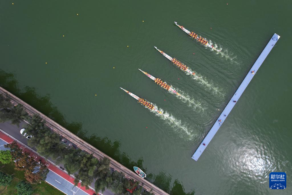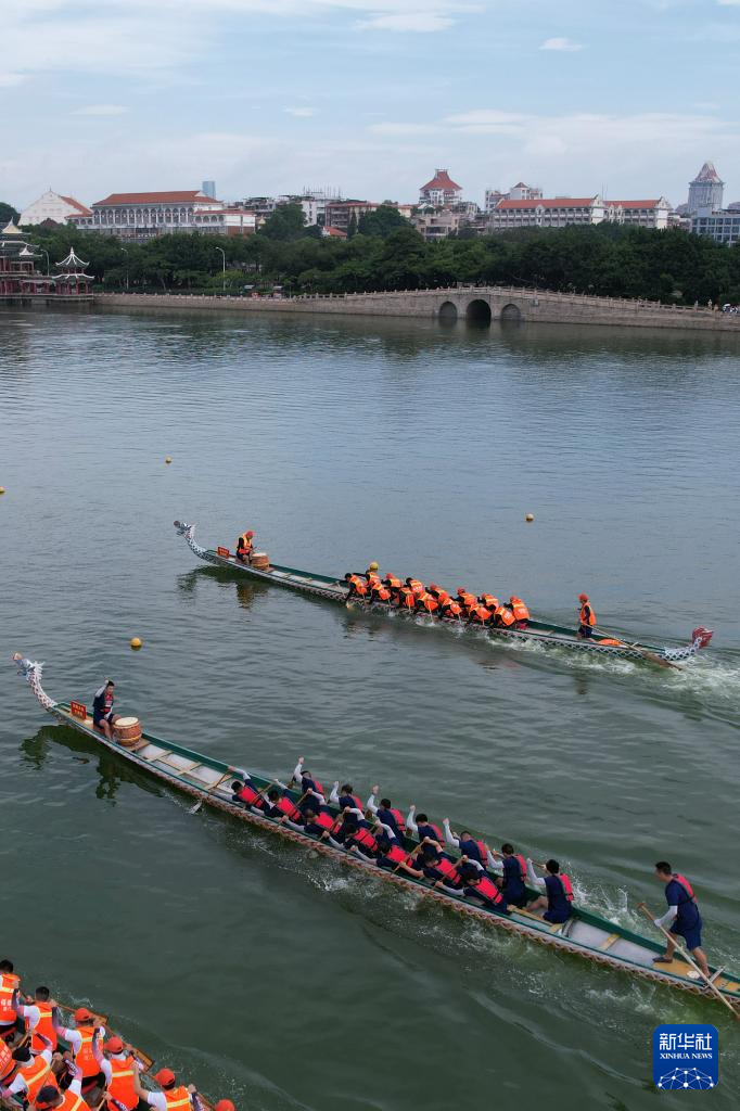 6月12日,消防员在福建厦门集美龙舟池进行龙舟比赛(无人机照片)。新华社发(曾德猛 摄)