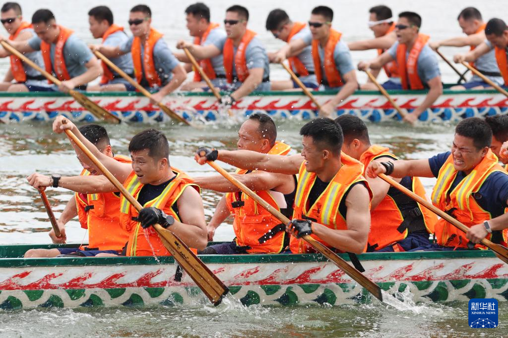 6月12日,消防员在福建厦门集美龙舟池进行龙舟比赛。