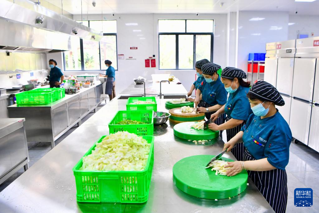 6月15日,福建武夷山市市级避灾安置点海亮研学基地食堂员工为因暴雨转移群众准备午餐。新华社记者 姜克红 摄