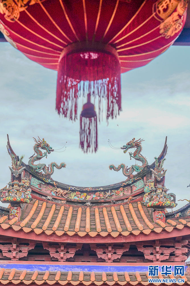 这是在白礁慈济宫拍摄到的红灯笼,与屋顶精美雕饰相映成趣。新华网 肖和勇 摄