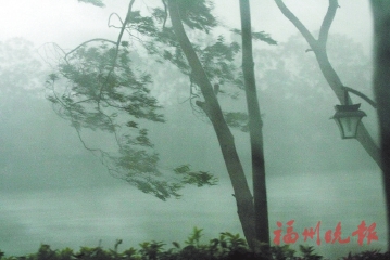 16日中午,福州突降暴雨,树枝在风中狂摆。