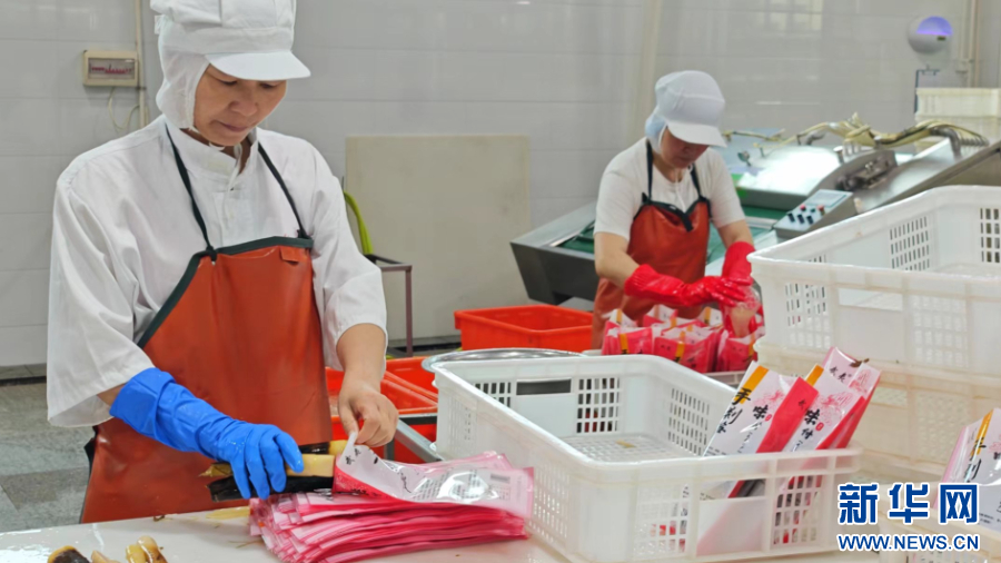 工作人员在车间里包装手剥笋。新华网 刘默涵 摄