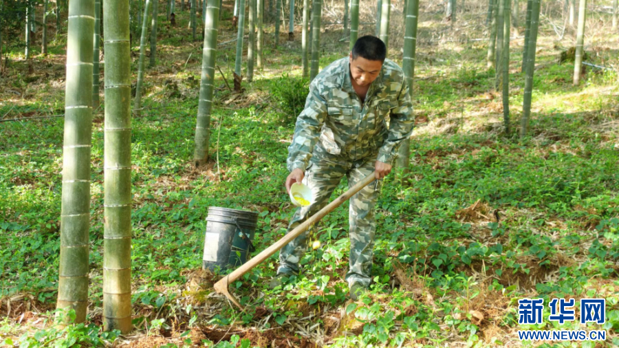竹农谢登瑞在给自家的竹林施肥。新华网 刘默涵 摄