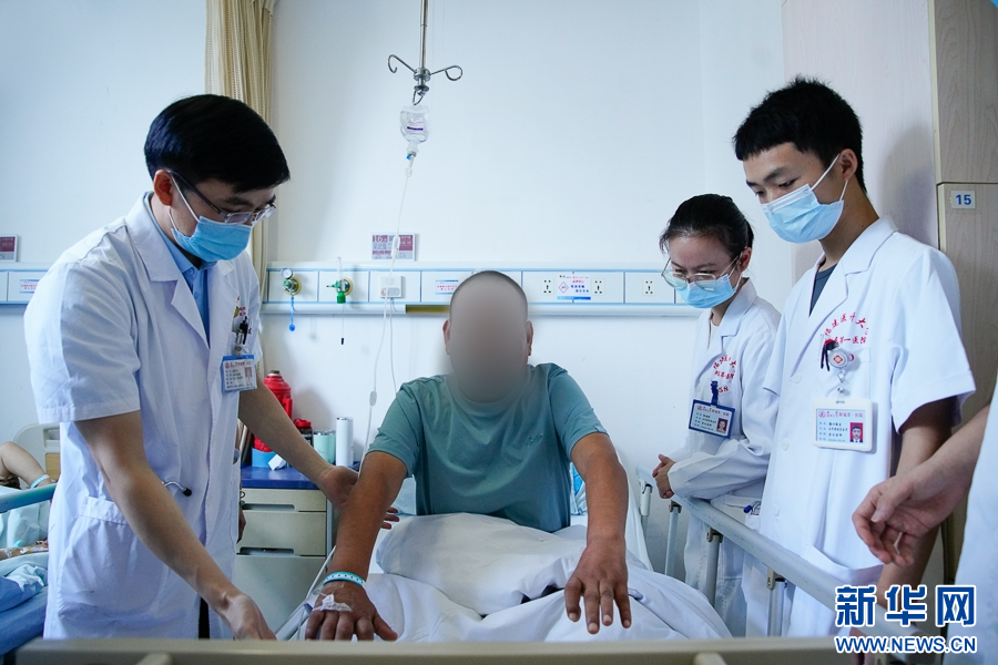 医生团队正在为渐冻症患者张振(化名)做检查评估,他的上肢已经很难高举。新华网 蒋巧玲 摄