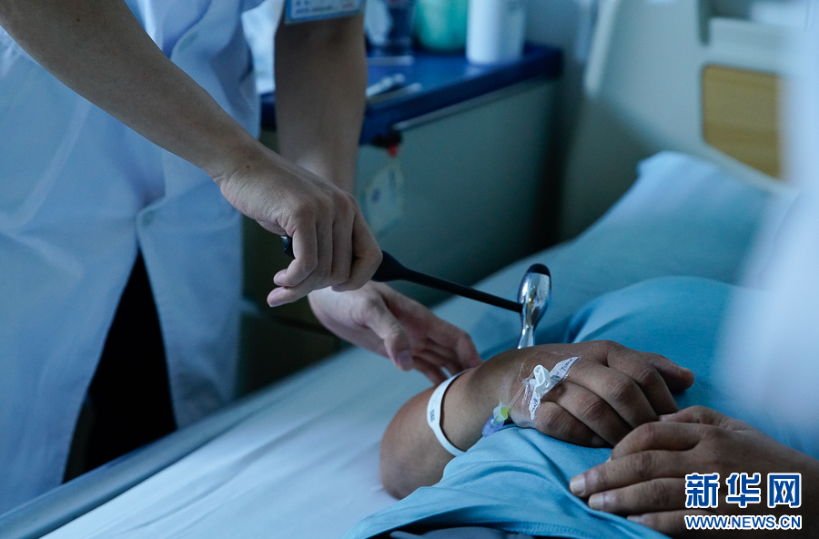渐冻症是一种罕见的运动神经元变性疾病,患者的身体会逐渐被“冻僵”。图为医生用叩诊锤查看患者的上肢反应。新华网 蒋巧玲 摄