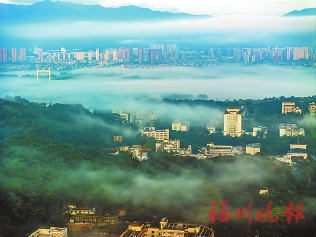 昨日清晨,福州上空久违的阳光透过薄雾。
