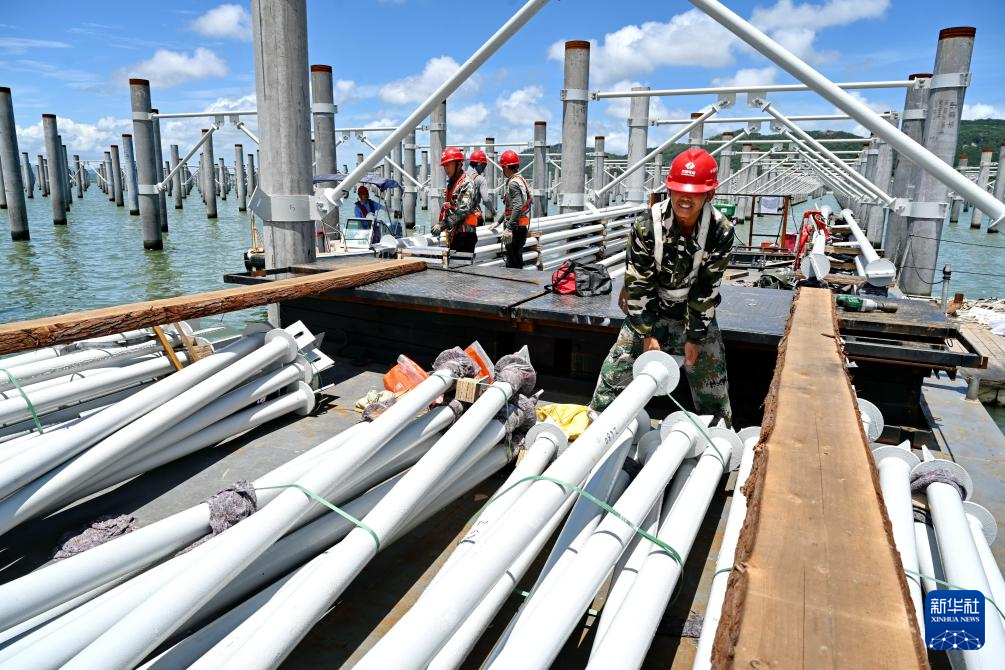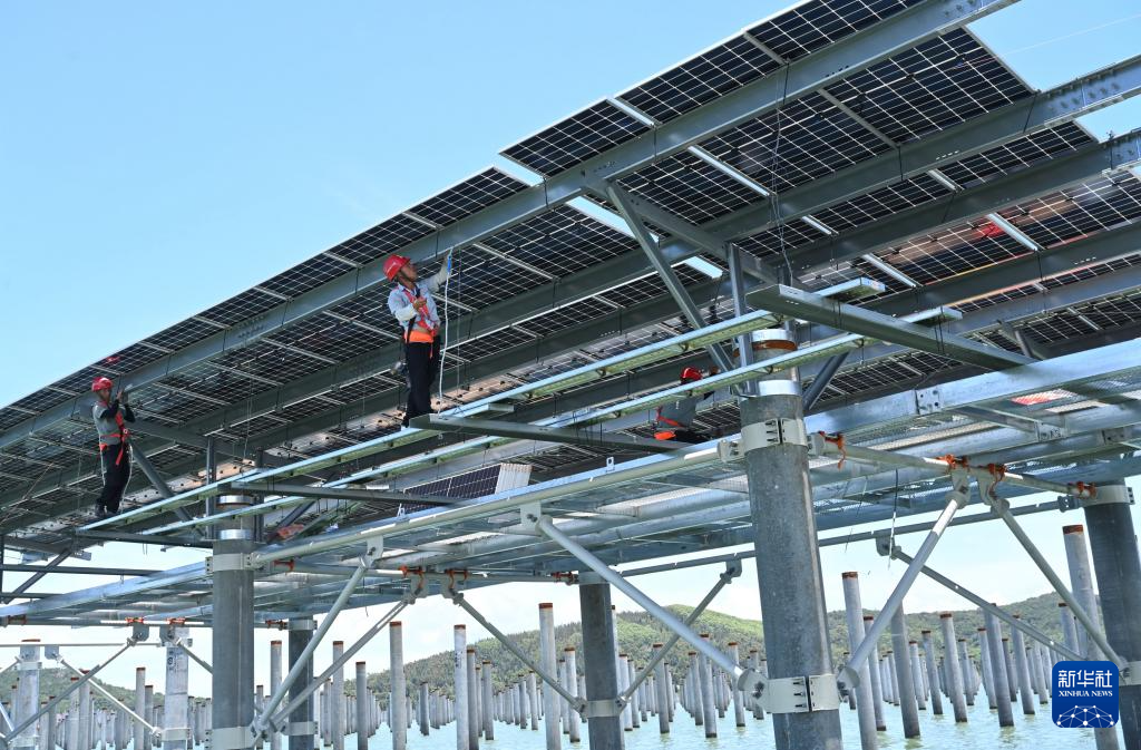 6月20日,施工人员在海上光伏电站现场安装支架和光伏组件。新华社记者 林善传 摄