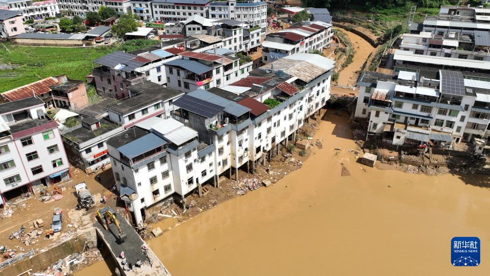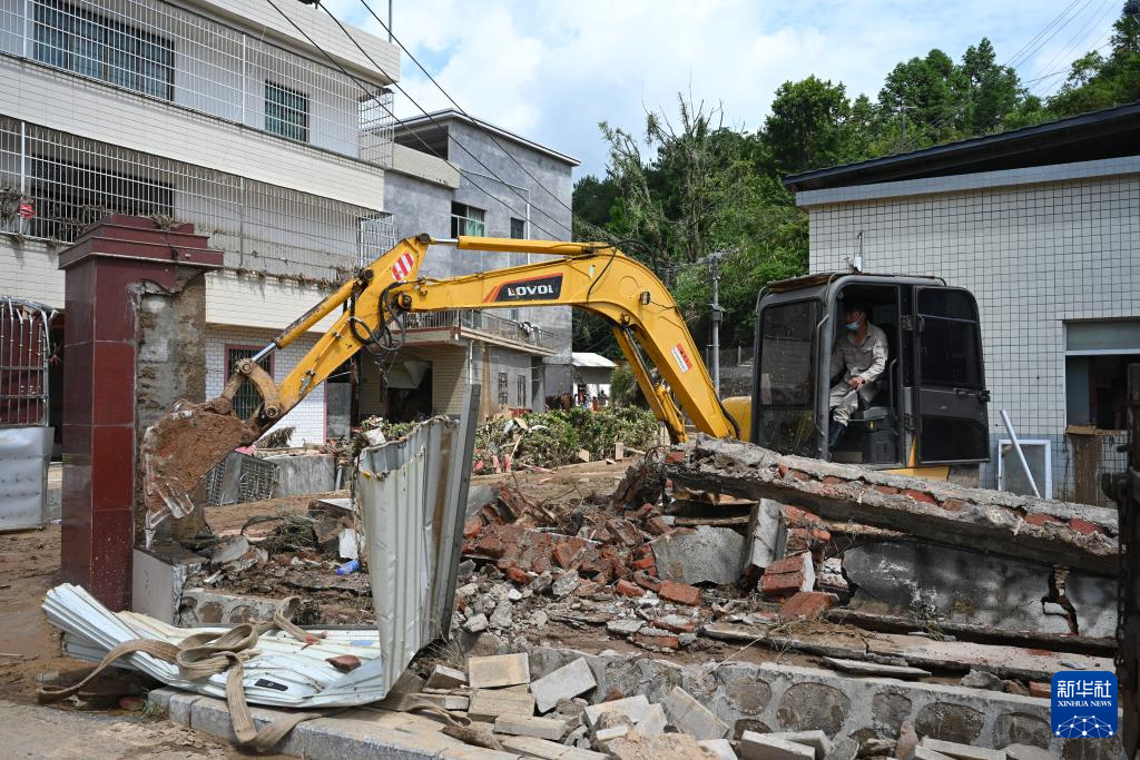 6月20日,在龙岩市武平县中赤镇,挖掘机在清理受损房屋。新华社记者 周义 摄