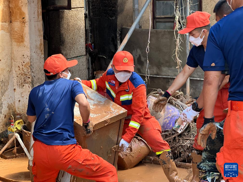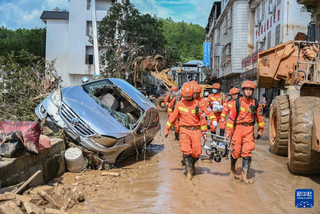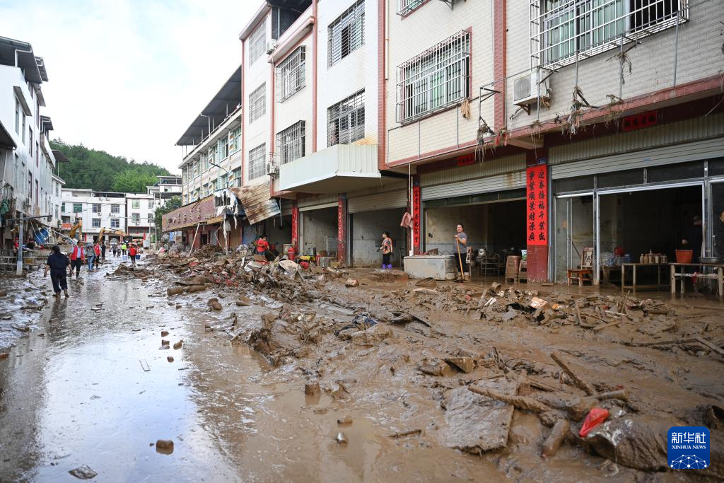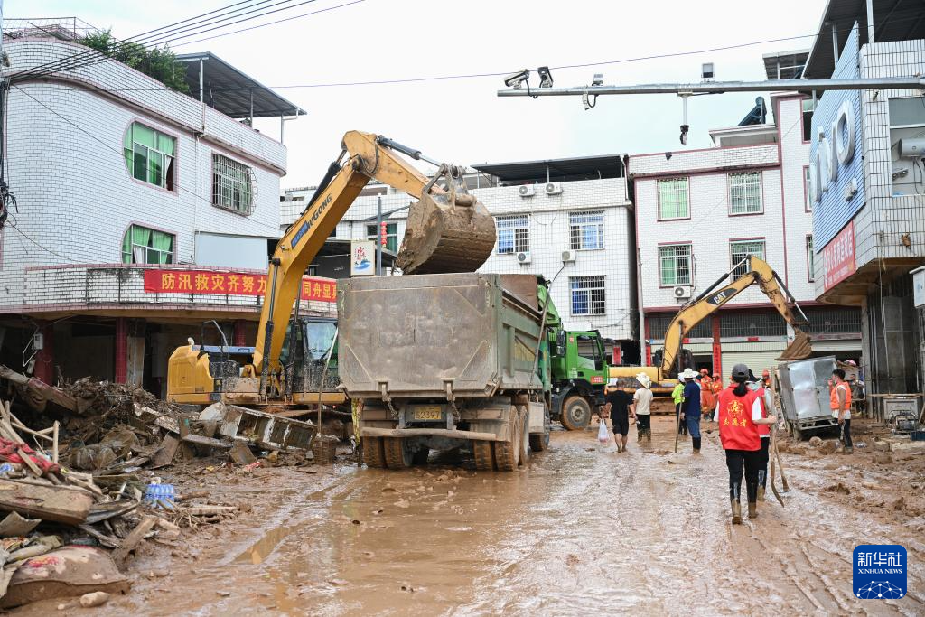 6月20日,福建省龙岩市消防救援支队救援人员在武平县下坝乡集贸市场旁,协助受灾群众转移物资,清理垃圾淤泥。新华社发
