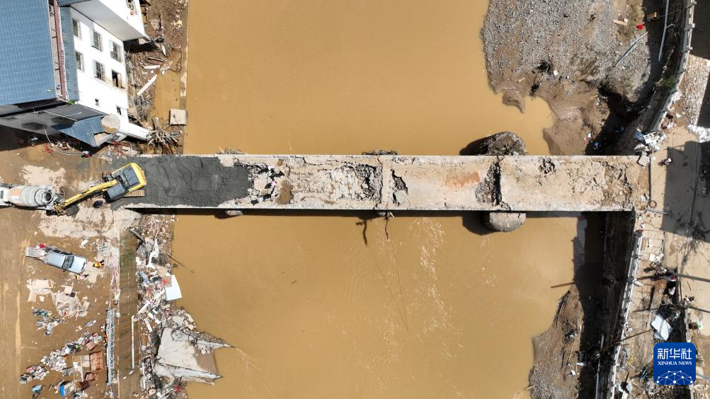 6月20日,救援力量在龙岩市武平县中赤镇抢修一座危桥(无人机照片)。新华社记者 周义 摄