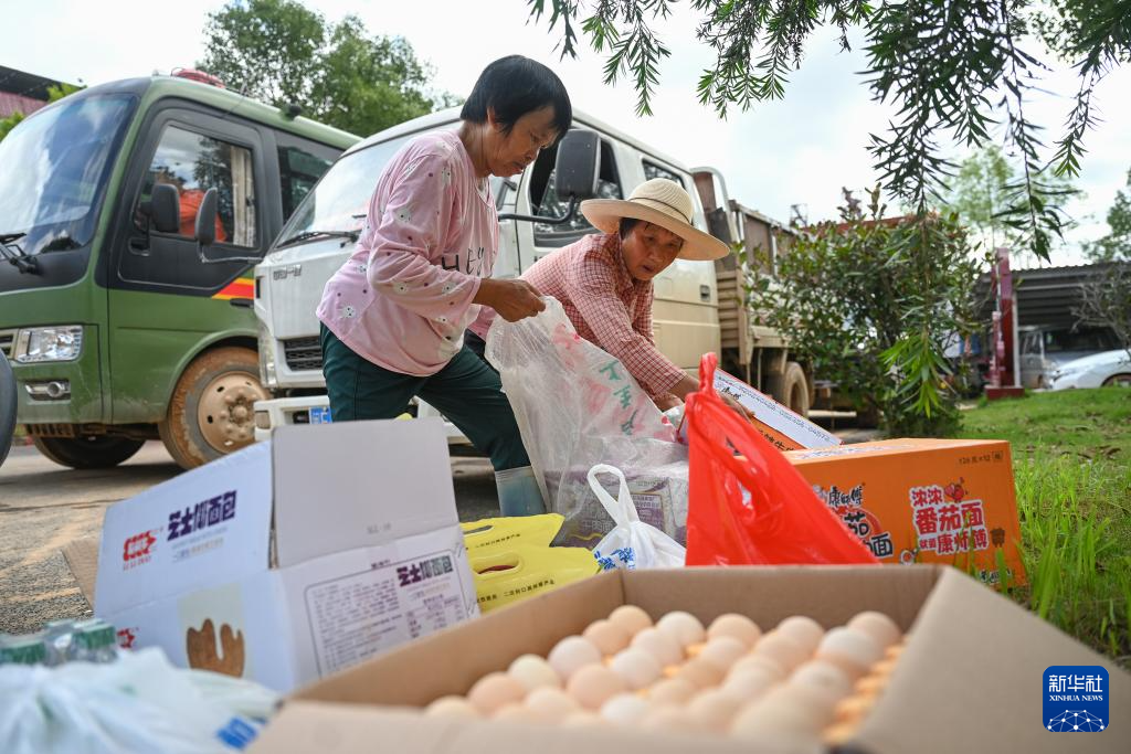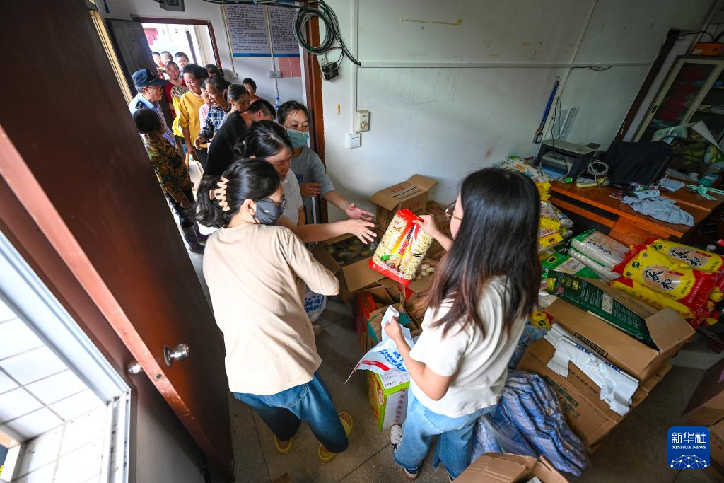 6月20日,村民在龙岩市武平县中赤镇镇政府领取生活物资。新华社记者 周义 摄