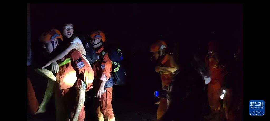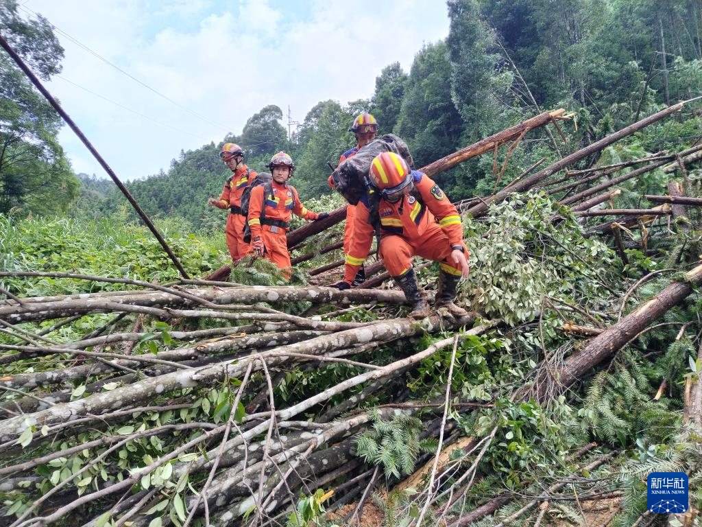 6月19日,福建省龙岩市消防救援支队救援人员从武平县下坝乡卫生院徒步四个多小时,为下坝乡美溪村村民送去食物、水等生活物资。新华社发