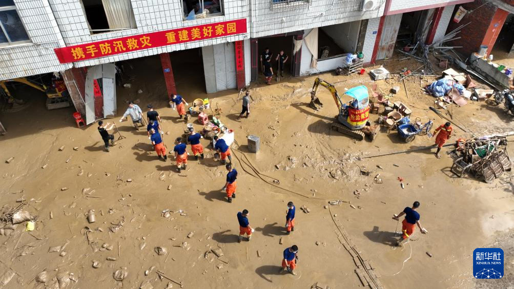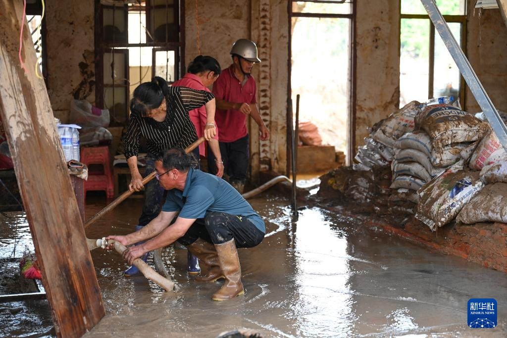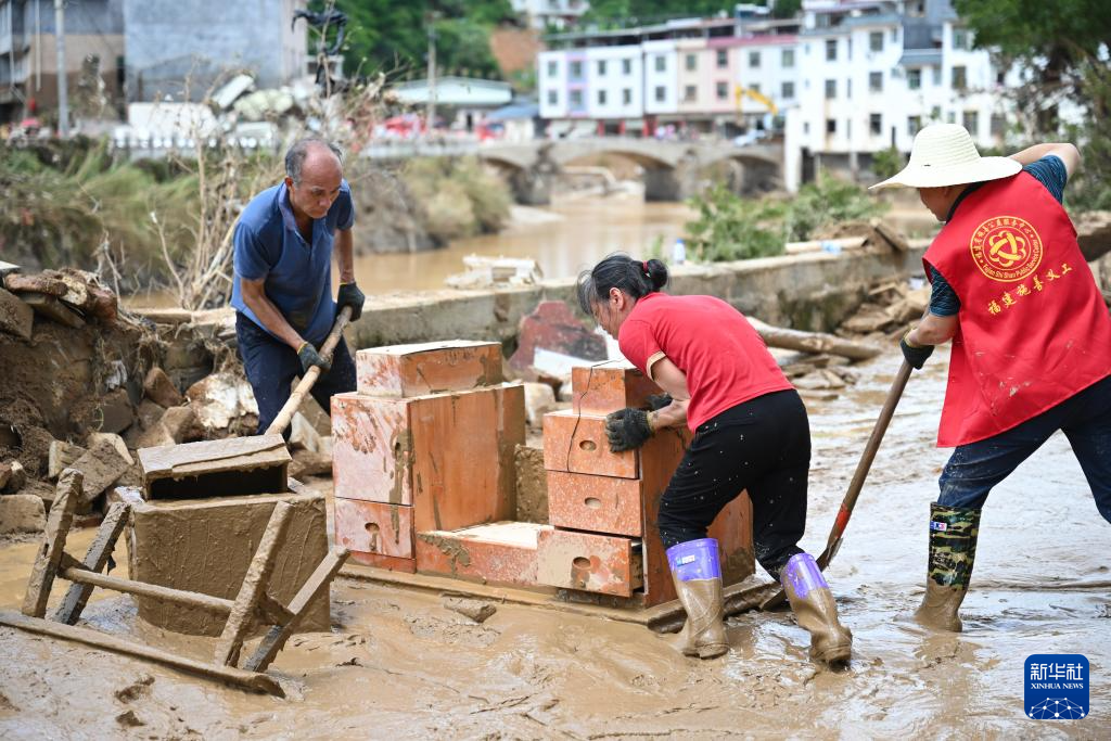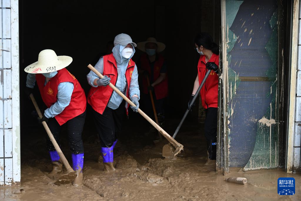 6月20日,志愿者在龙岩市武平县中赤镇帮助村民清淤。新华社记者 周义 摄