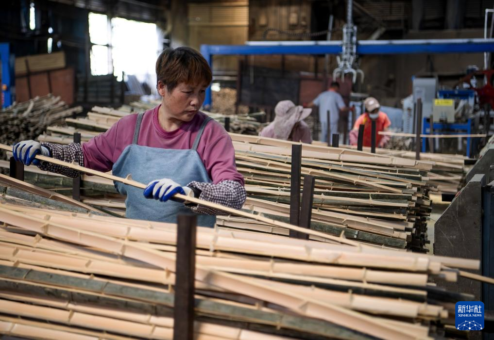 6月23日,在福建亿森竹业,工人把切割好的毛竹片进行拼合。新华社记者 魏培全 摄