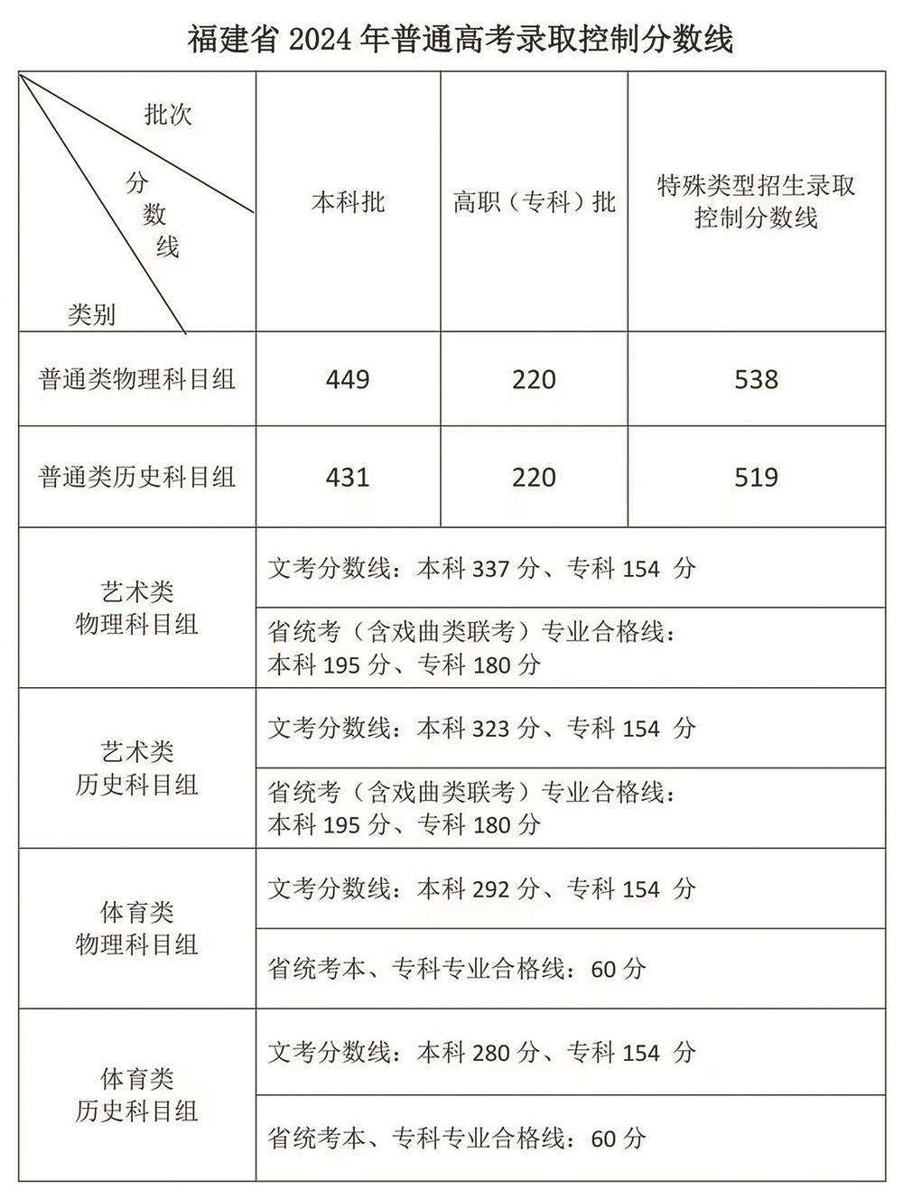 24日,福建省高等学校招生委员会召开全体会议,研究确定我省2024年普通高考切线方案,部署高招录取工作。经会议研究决定,我省2024年普通高考各类录取控制分数线具体如下: